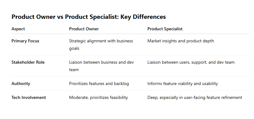 While this article focuses on the Product Owner vs Product Specialist in app development, many clients ask about Product Managers (PMs). PMs typically own the broader product strategy, roadmap, and lifecycle—often operating at a higher level than POs or PSs. Think of the Product Manager as the architect, the Product Owner as the on-site project manager, and the Product Specialist as the detail-savvy consultant who ensures every brick fits.